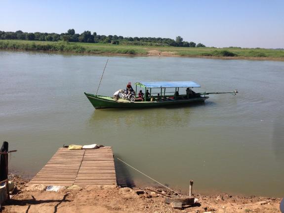 The drive to Bagan was uneventful until we reached a river crossing. The bridge over the river (upper left in the picture) was closed for repairs and traffic was detoured to a shallow ford through the river. Unfortunately, a bus had broken down on the far side of the river blocking traffic in both directions. Only scooters could cross.