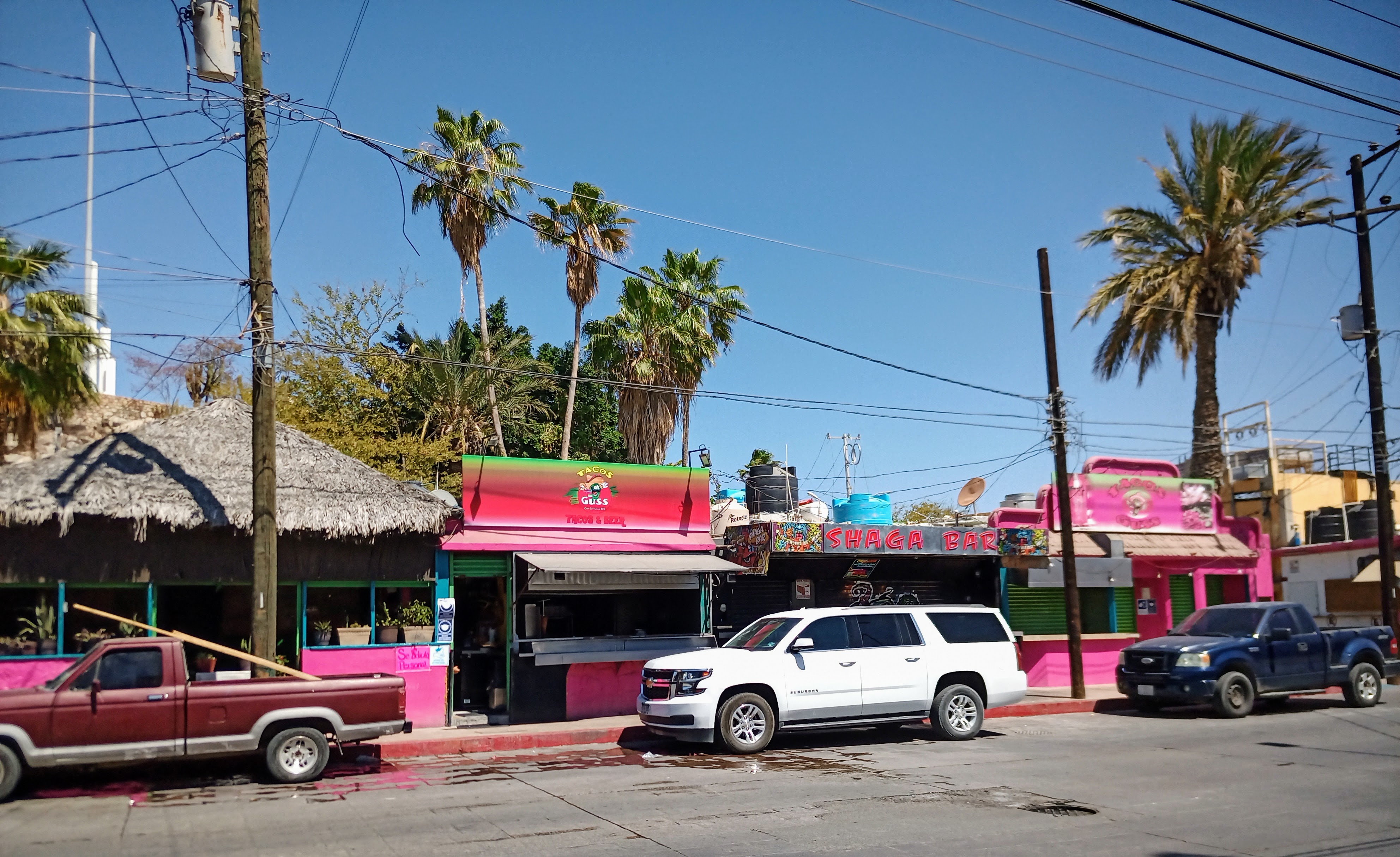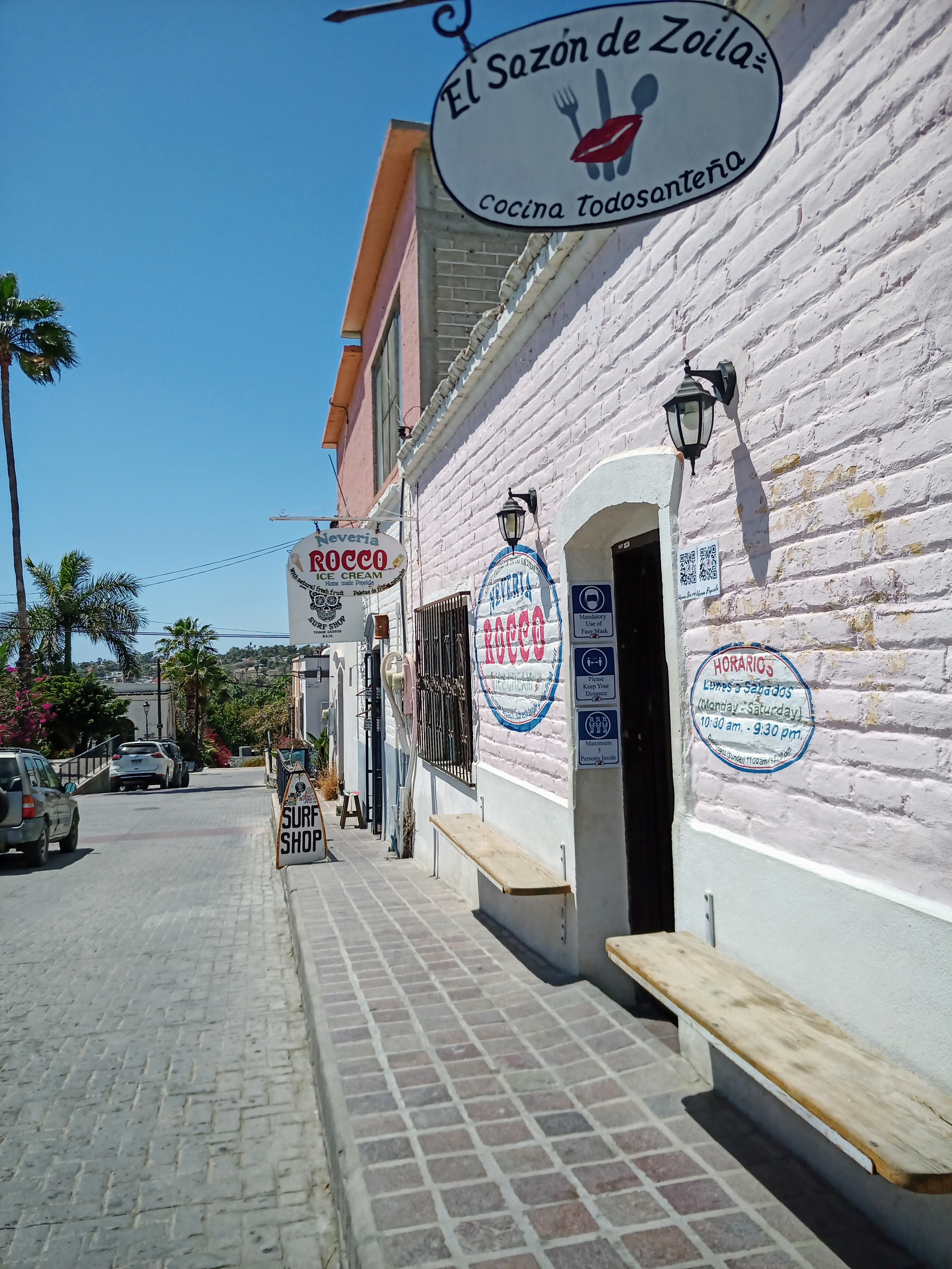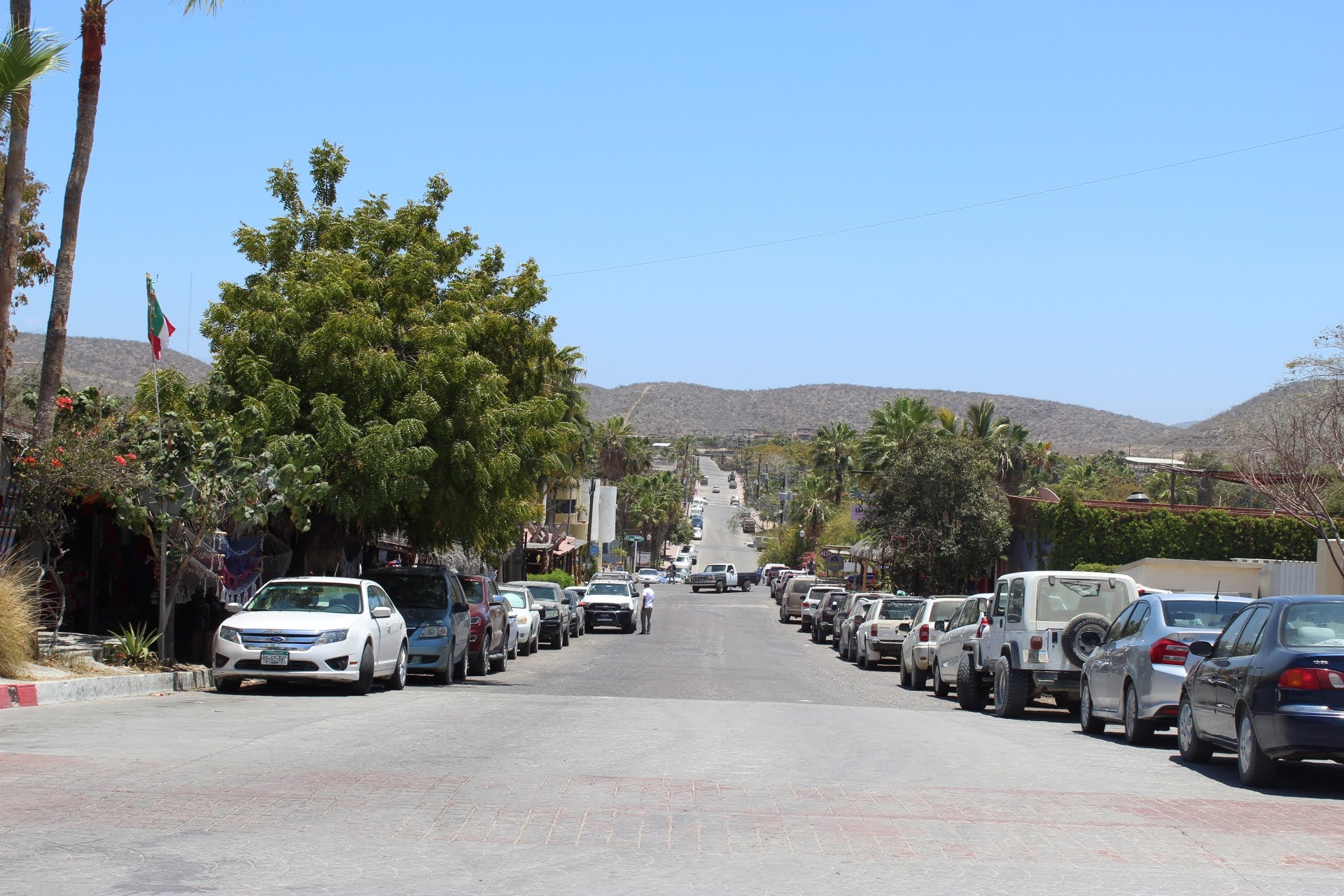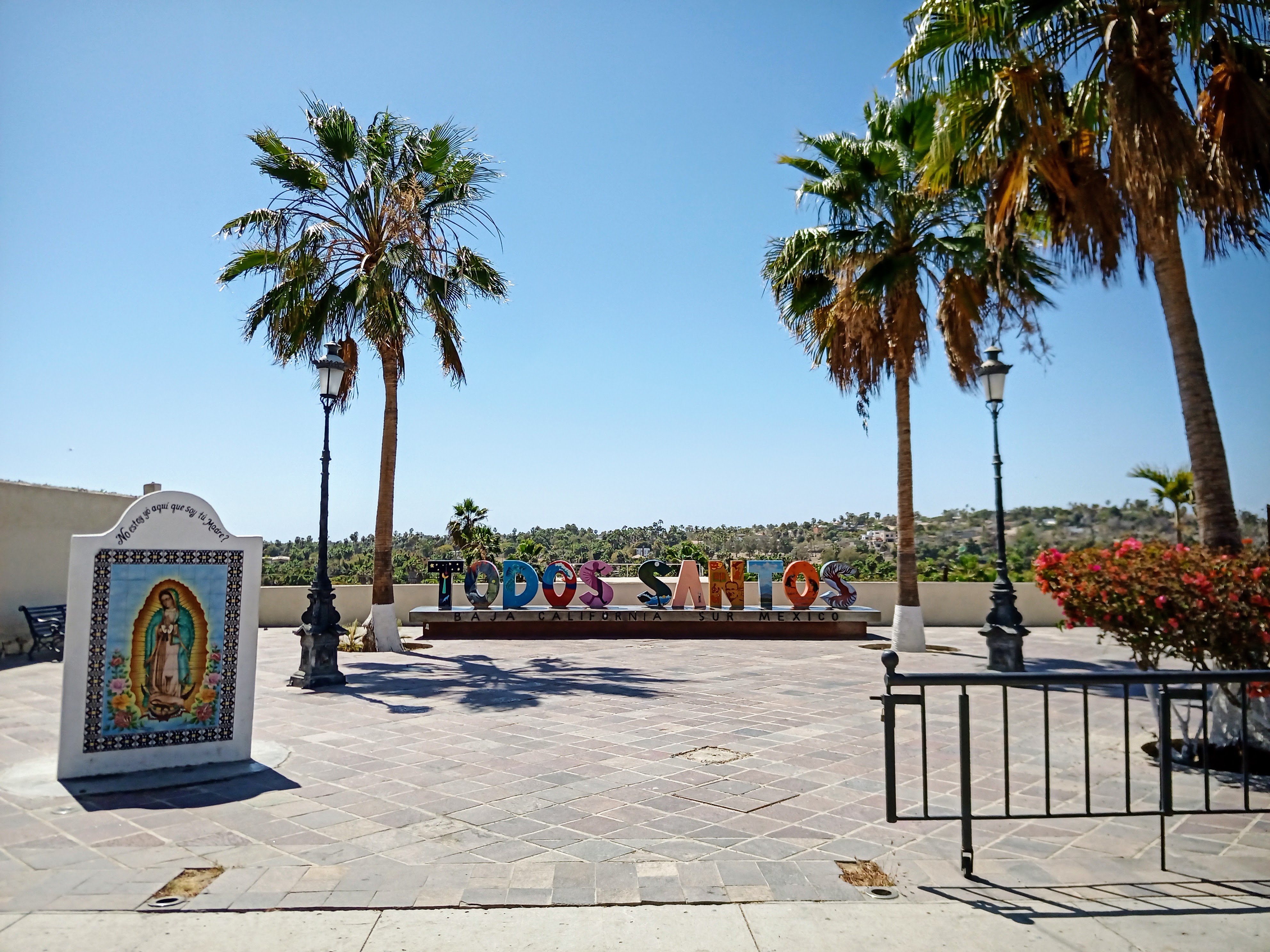 Todos Santos (population: 6,485) is a little artists’ colony an hour north of Cabo San Lucas. It is pretty much a one street (Benito Juarez Street) town, and is pretty laid back and welcoming. Street parking was not hard when we were there.